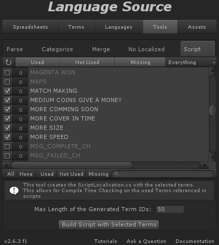 string text1 = I2.Loc.ScriptLocalization.MyKEY; // instead of I2.Loc.ScriptLocalization("MyKEY") string text2 = I2.Loc.ScriptLocalization.Tutorial.MyKEY; // instead of I2.Loc.ScriptLocalization("Tutorial/MyKEY") string text2 = I2.Loc.ScriptLocalization.Tutorial.Tips.MyKEY; string text3 = I2.Loc.LocalizationManager.GetTranslation( ScriptTerms.Tutorial ); // instead of I2.Loc.ScriptLocalization("Tutorial/MyKEY") |