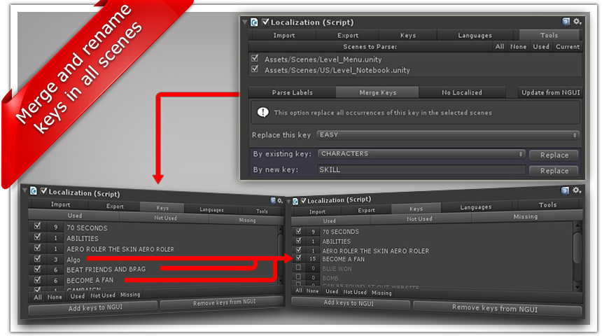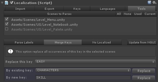 A similar issue happens when we need to replace a key by another one in all scenes. Like when you have an END_SCREEN and STOP_DIALOG key which both translate to the same text "Cancel". So both keys could be combined into a new key CANCEL. Normally, you should go through all labels using either of the two terms and replace that by the new one. Thats a tedious manual process that could lead to errors.