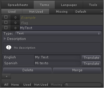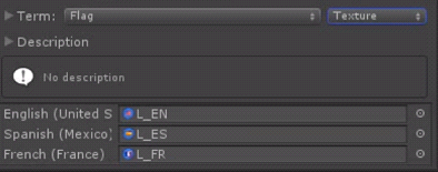 By changing the term’s Type, the translation inspector for each language will be modified accordingly. That way, if for instance the type is “Texture” the inspector will allow dragging a texture into each language and show a preview.