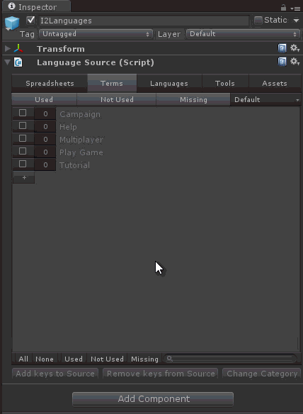 Select the global Language Source at Assets \ Resources \ I2Languages.asset