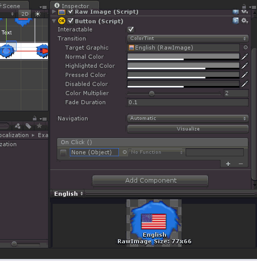 To allow changing languages, add an I2 \ Localization \ SetLanguage component to your buttons.