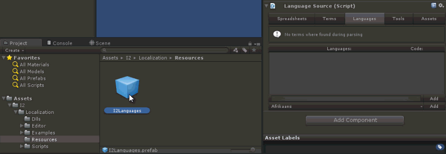 When installing the plugin, a default Source is created in an asset named I2Localization at Assets > Resources.