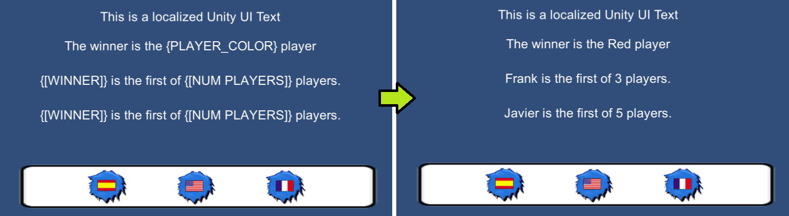 Texts like "The winner is {[WINNER}]" can be translated at runtime to "The winner is Frank".