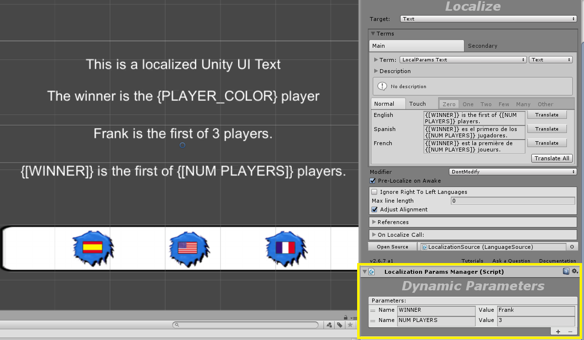 public class RegisterGlobalParameters : MonoBehaviour, ILocalizationParamsManager { // Register this class every time this object is enabled public void OnEnable() { if (!LocalizationManager.ParamManagers.Contains(this)) { LocalizationManager.ParamManagers.Add(this); LocalizationManager.LocalizeAll(true); } } // If the object is disabled, then unregister it public void OnDisable() { LocalizationManager.ParamManagers.Remove(this); } // Find the value of Parameters or return null if not found public virtual string GetParameterValue( string ParamName ) { if (ParamName == "WINNER") return "Javier"; // You should get this value from your Game Manager