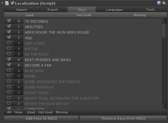 - Used: Adds or Remove to the list the terms from the LanguageSource that are actually used in the scenes. They will always show a number higher than 0 because they are used at least once.