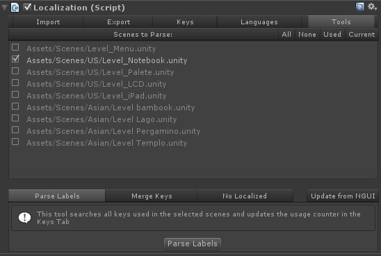 When clicking on the Parse Labels button, the editor will open each of the selected scenes, and search through all of the localizable objects (Text, UILabel, TextMesh, etc) components to track Terms usage.