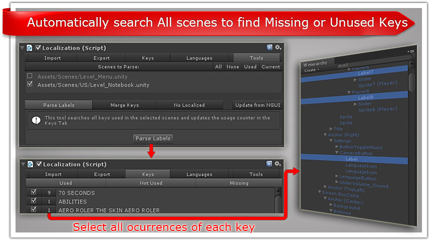 One of the major issues developers found when setting the localization its to keep track of which of the keys are no longer used in any scene. As well as finding which keys are used in the scenes but hasn't been set in the localization data.