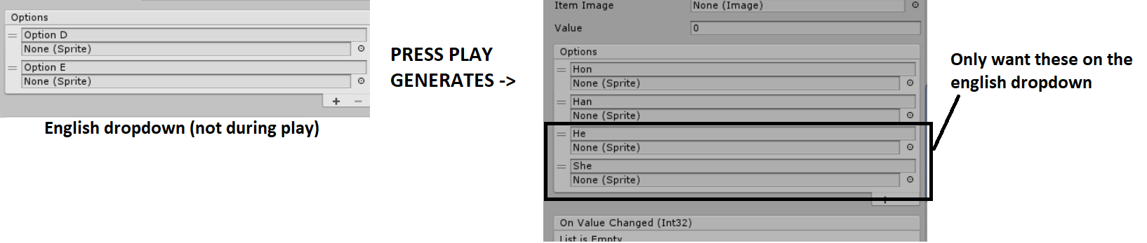 But now I want to translate my game into swedish. So I have two buttons, one should activate a dropdown with HE and SHE language alternatives, and one a swedish dropdown with HAN and HON. But when I play the scene both dropdowns contain all alternatives, AKA HE, SHE, HAN, HON.