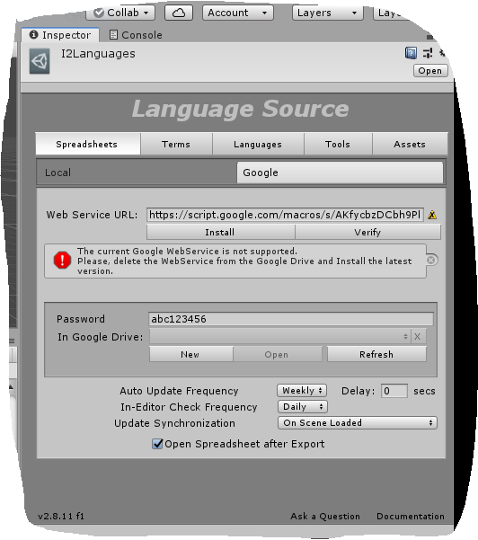 - Can you double check that you didn't change the WebService password (either in the WebService code or the I2Languages.asset)?