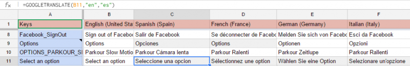 That way, any modification to the other columns will update the translation. Also those cells are highlighted with a different color to identify them.