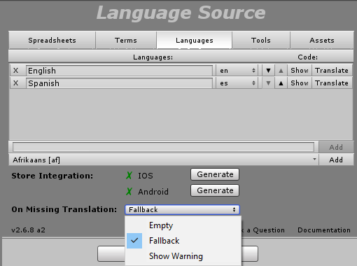 NEW: When a term is not defined for some language, it can be set to display (Empty, Fallback or a Warning) The setting is in I2Languages.prefab Language Tab