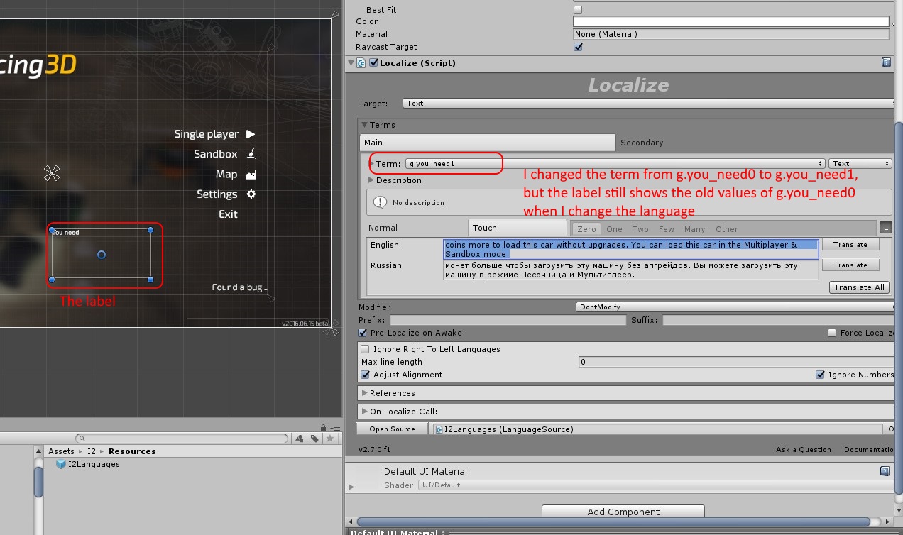 - If I change the term of this label, the label changes in the play mode, but still shows the old traslation of this other term.