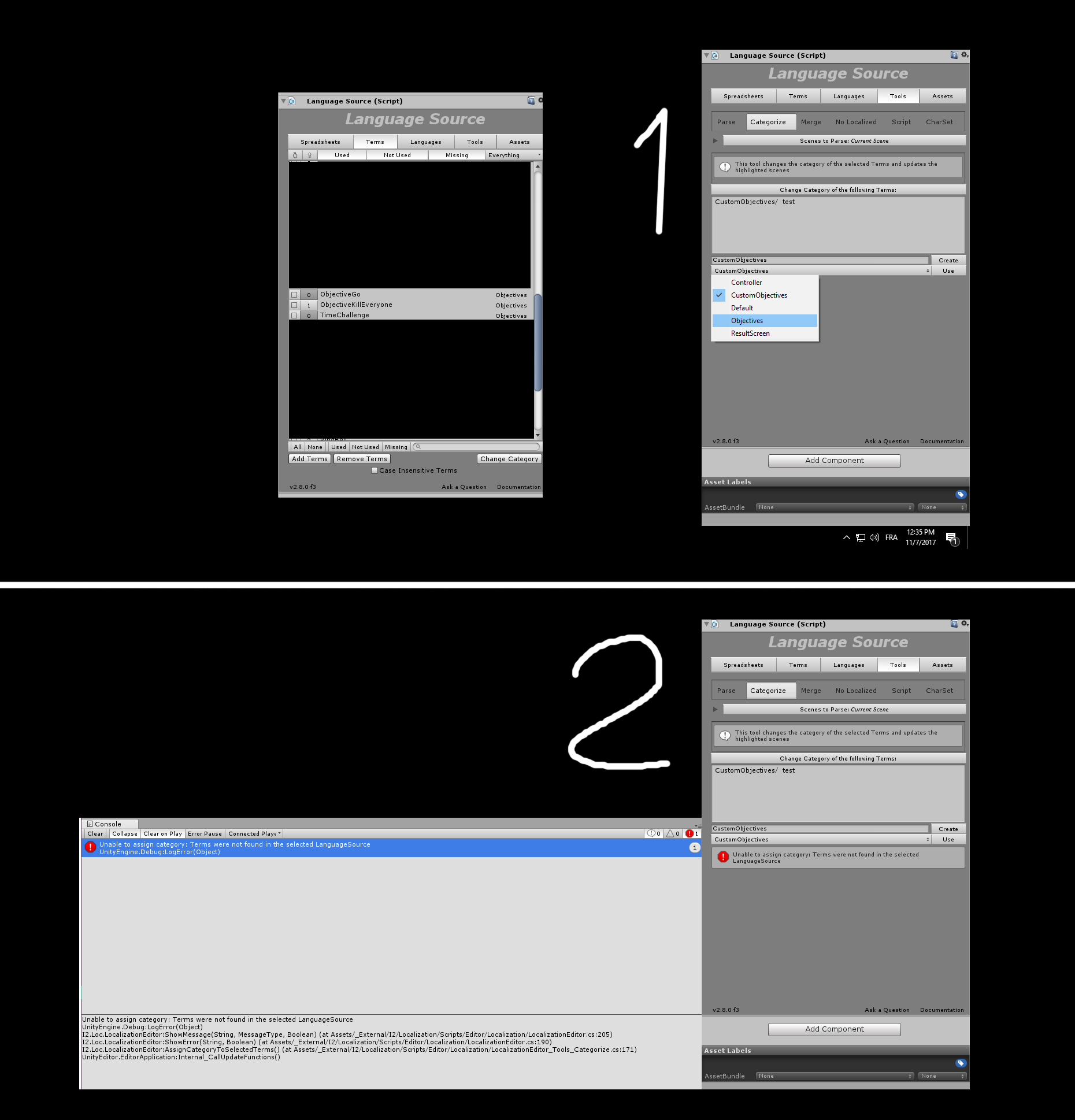 I have a category ''Objectives'' that contains 3 Terms. It worked all fine for the past months. We didn't upgrade Unity or the Asset recently. Today I was trying to add a new Term to the category and I got that error. Now, even if I revert my change to the I2Languages prefab, my Terms that are in the category ''Objectives'' are considered like they don't exist and are not working properly.